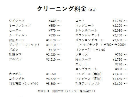 クリーニング価格を 一割程度 値上げさせていただきます。